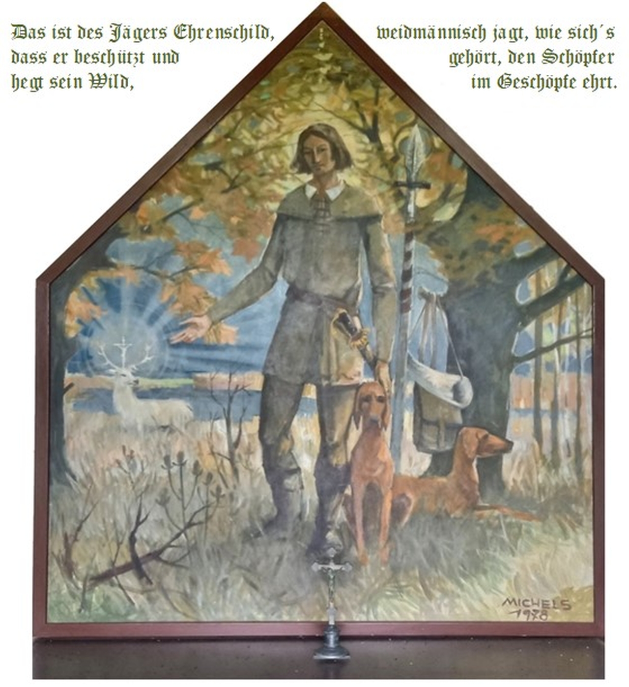 In diesem Werk vom akademischen Maler Josef Michels aus Oggau, einem engen Freund des Mitinitiators Oberamtsrat Hermann Molnar, wird er mit all seinen mittelalterlichen Jagdutensilien dargestellt.