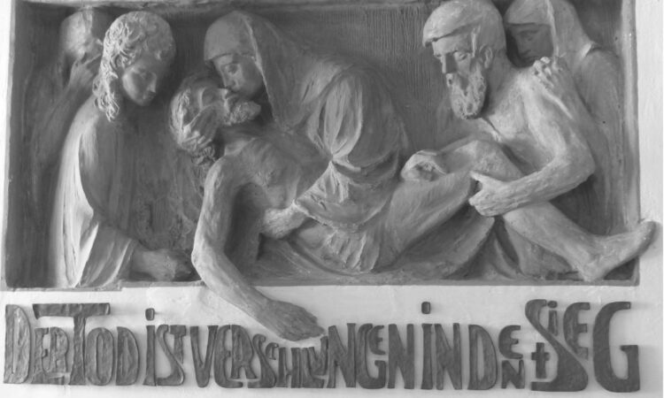 Gesegnet, wer mit einem solchen Glauben, einen geliebten Menschen zu Grabe tragen kann. Dass der Tod verschlungen ist in den Sieg – verschlungen, das heißt überwältigt, verschwunden. Maria, die ihren Sohn ein letztes Mal in den Armen hält und die Freundinnen und Freunde Jesu hatten diesen Glauben am Karfreitag nicht – wie sieht es mit mir aus? Zweitausend Jahre später? Mit den in den Evangelien überlieferten, ungezählt häufig gehörten und gelesenen Auferstehungsberichten? Mal so, mal so. Ich habe den Auferstehungsglauben nicht wie in einem Aktenordner oder auf CD, jederzeit abrufbar. Ich wachse in dem Glauben an die Auferstehung Jesu, Rückschläge inklusive. Und ich bitte um diesen Glauben.